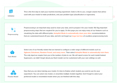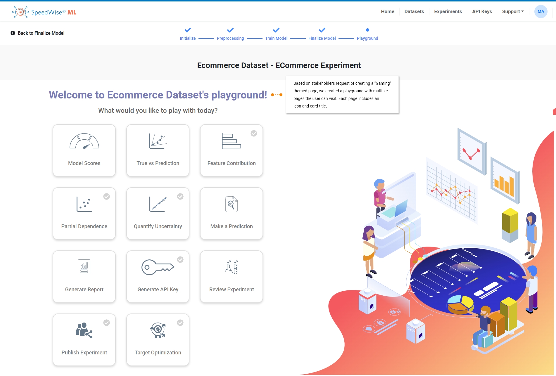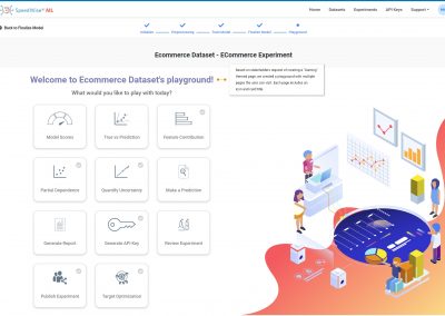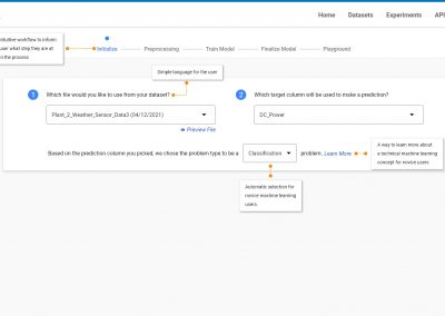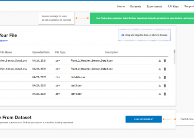 1. Customizing the landing page based on the type of the user –Â New users that have never used the platform before land on the dataset page, because this is the first step to create a machine learning experiment. Existing users that have logged in more than 3 times will land on the home page. The home page includes statistics about number of experiments created, datasets created, and more.Â