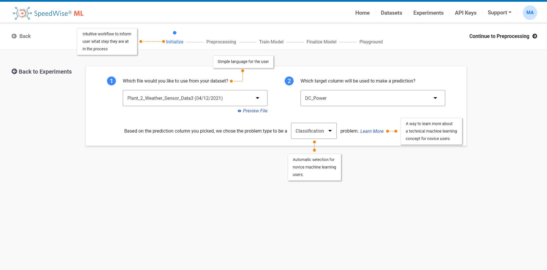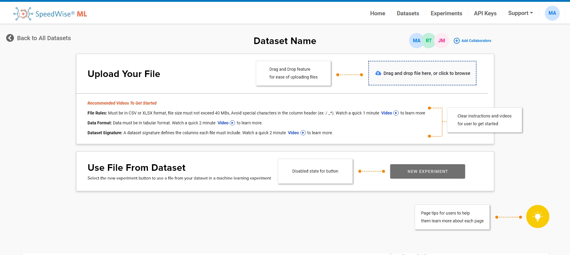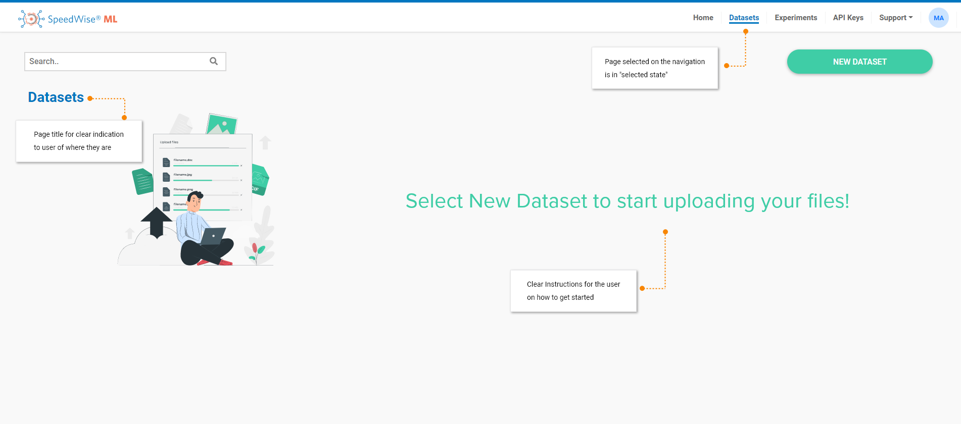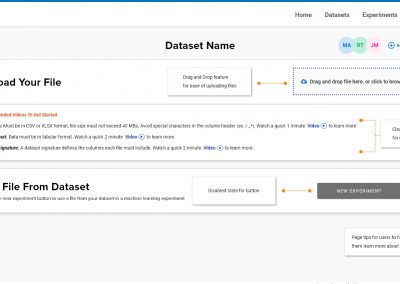 Description: Create an intuitive onboarding workflow to follow for the user journey in order to help guide them on how to create a Machine Learning dataset