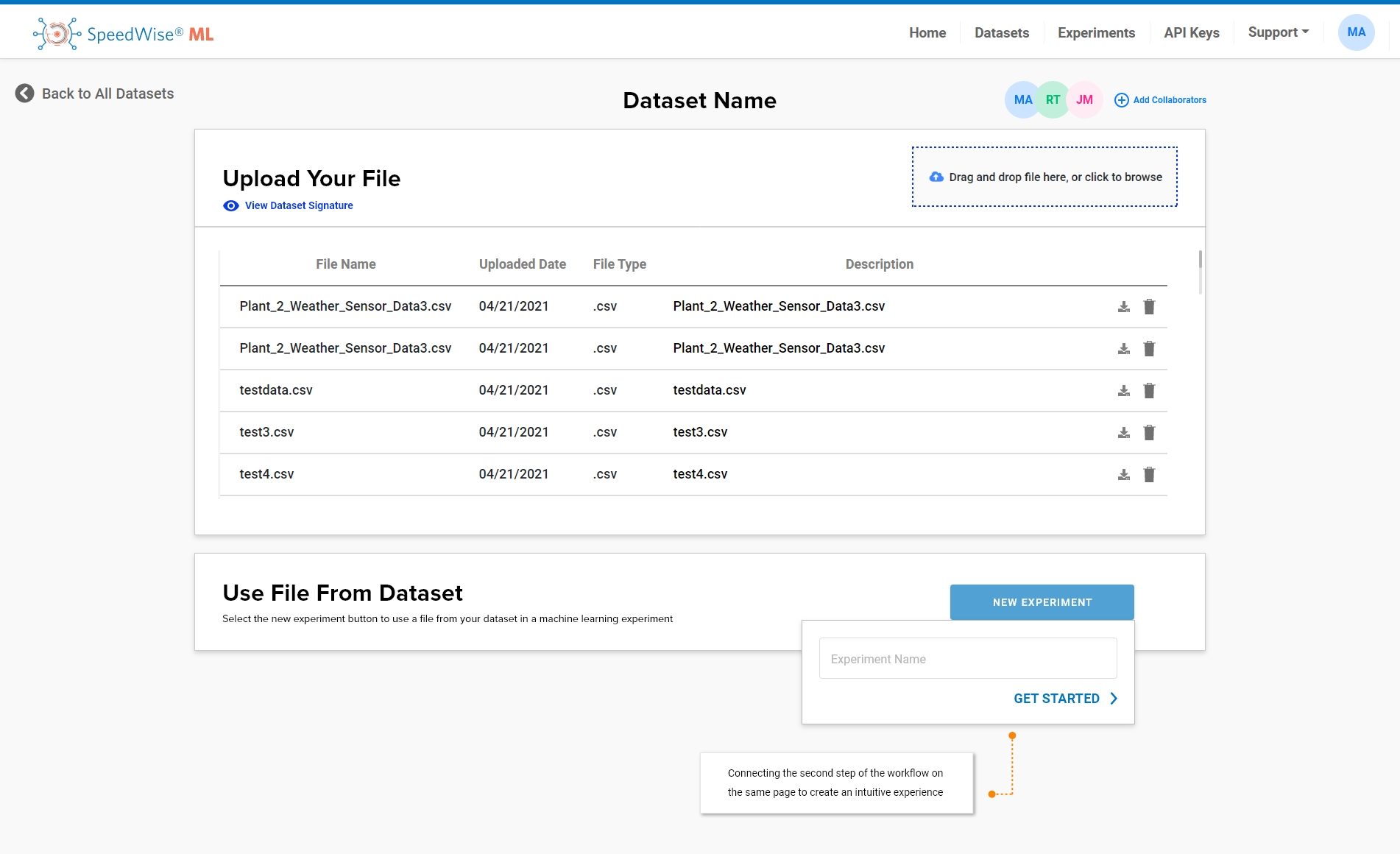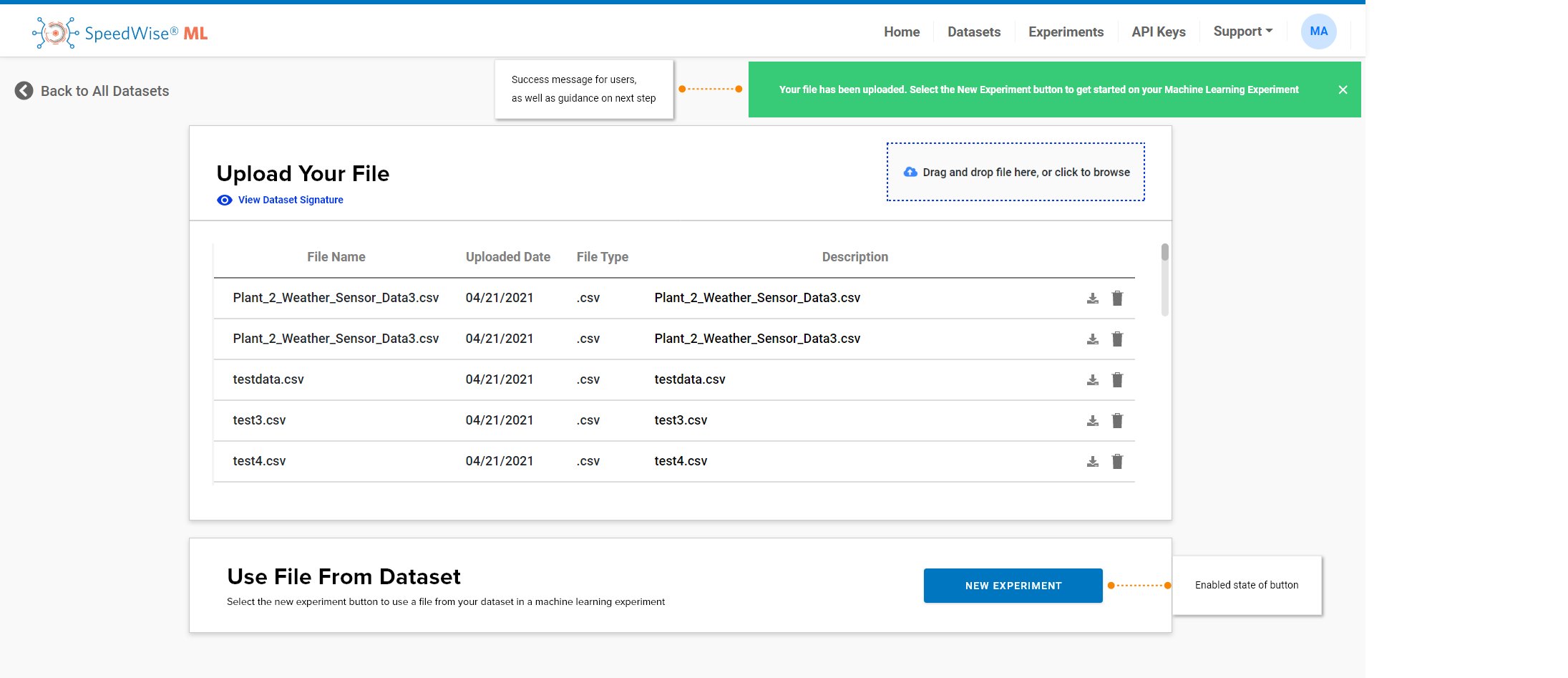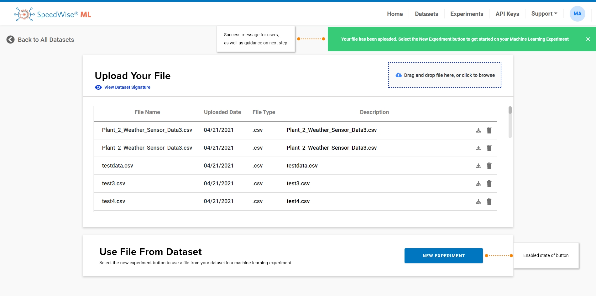 3. Direction On Next Steps: Once the file is uploaded, the user will get a notification that they are ready to create an experiment. The option to create an experiment is enabled on this page directly after uploading the file. The user can directly use the file uploaded to create a new experiment.