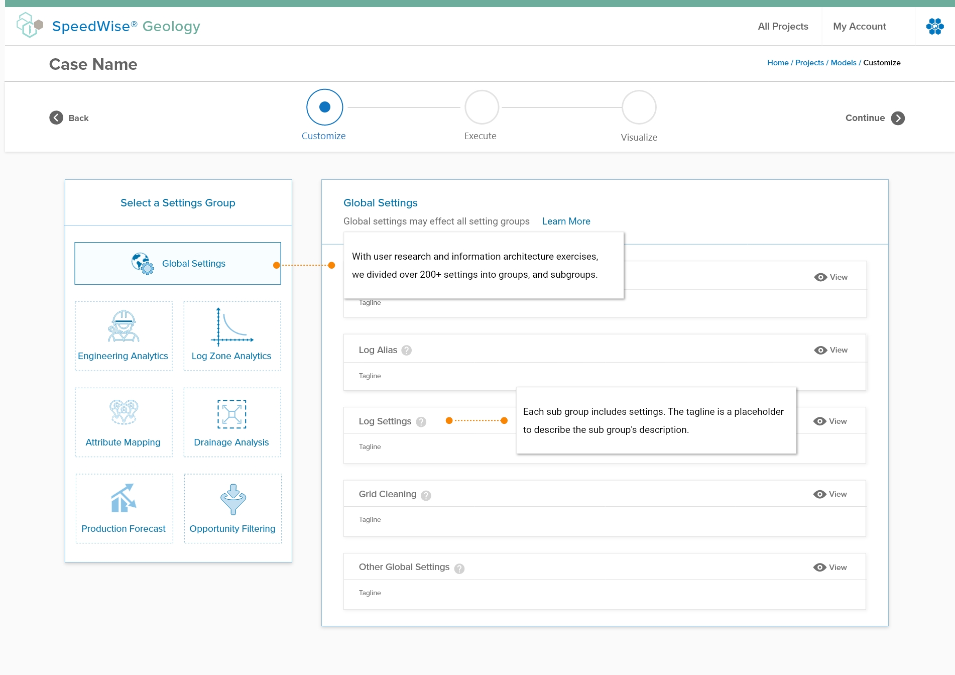 8. The next step is to create the low-fidelity wireframe. The wireframe went through iterations, and the final high-fidelity wireframe is shown below. The wireframe is divided into two columns. The left-hand column is the navigation panel. The purpose of this structure is to help the user find the settings that they are looking for based on the navigation panel. For example, they may be interested in a DCA related setting. An oil and gas domain user would expect to find this setting under “Engineering Analytics.” Once they click on the “Engineering Analytics” group, they will find a subcategory for DCA. The sub-categories are closed by default to avoid a cluttered interface. There were also icons and subtle colors used to create a clean and inviting interface.